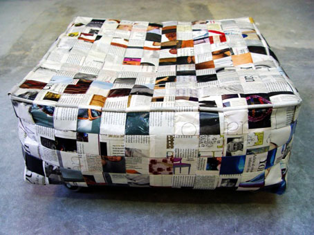 El Sofá Away, está hecho reutilizando un palet de madera, la estructura está hecha trenzando papel, y también contiene papel reutilizado para rellenar el interior.